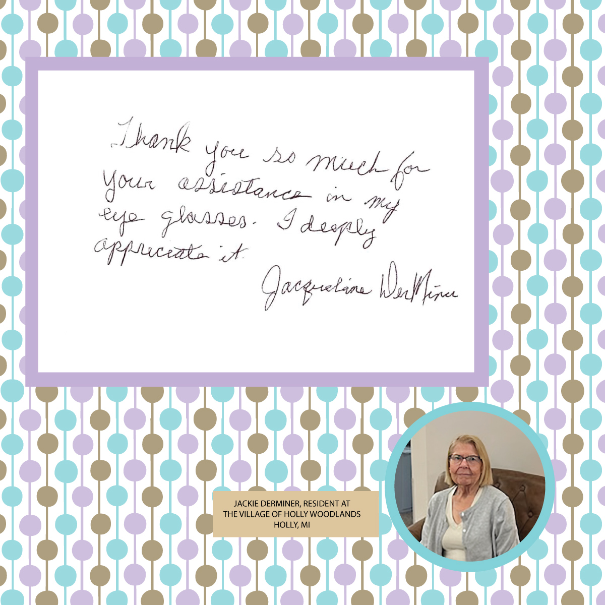 Thank you so much for your assistance in my eye glasses. I deeply appreciate it. Jackie Derminer, The Village of Holly Woodlands Holly, MI. ...