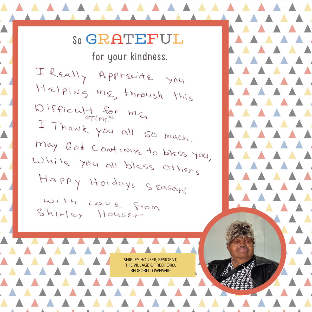 I’m so elated to write this note to you. Thank you for your help. Now I can get my car repaired. I couldn’t have done it on my own. I am appreciative for the financial help. I live in the Village of Peace Manor in Clinton Twp, MI and I truly enjoy living here.…...